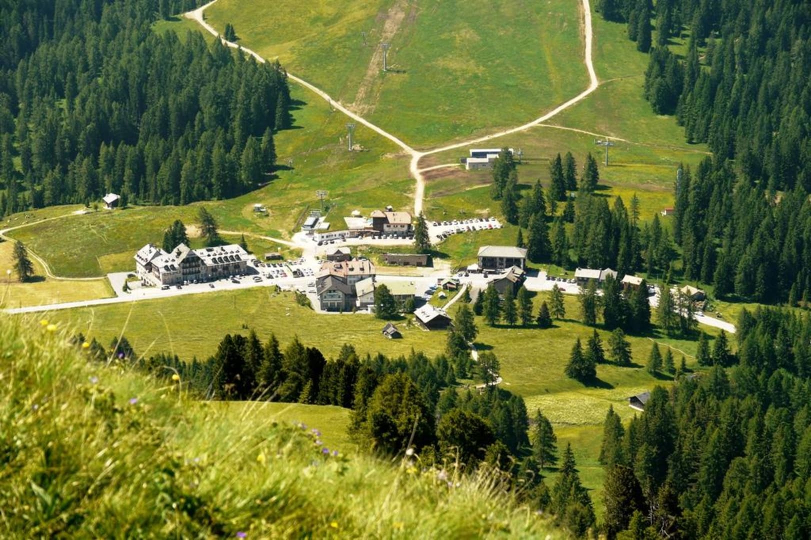 CostalungaHotel Savoy a jeho bezprostřední okolí ze stezky pod Roda di Vael