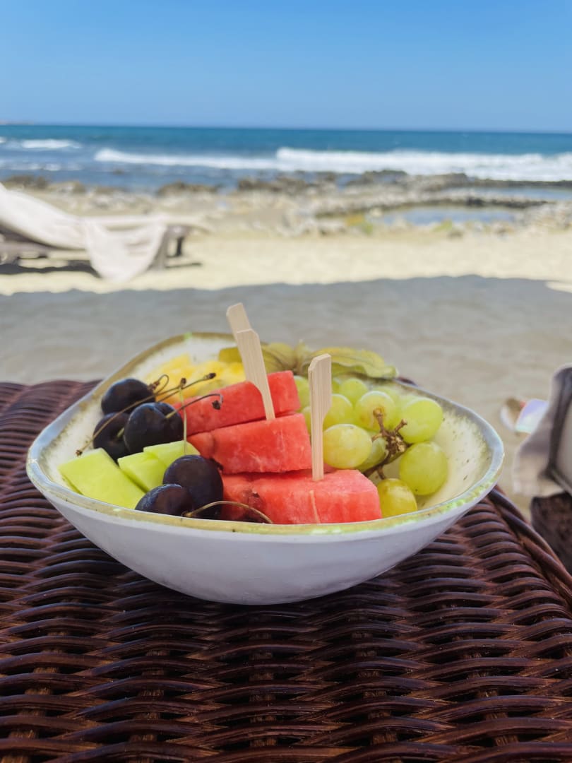 Als Willkommensgeschenk am Strand gabs frisches Obst
