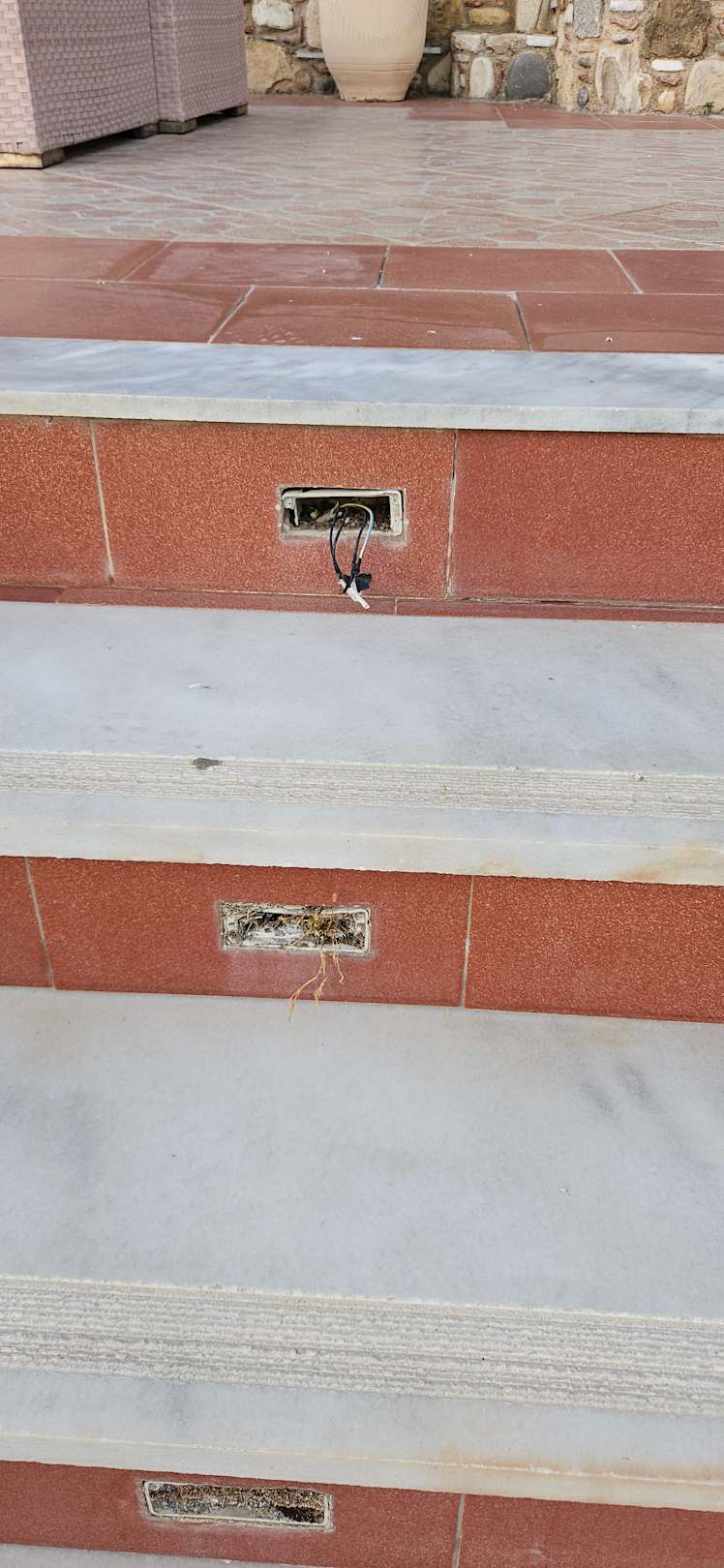 Beleuchtung der Zuwegung defekt, mit offen liegenden Kabeln (hier droht Lebensgefahr)
