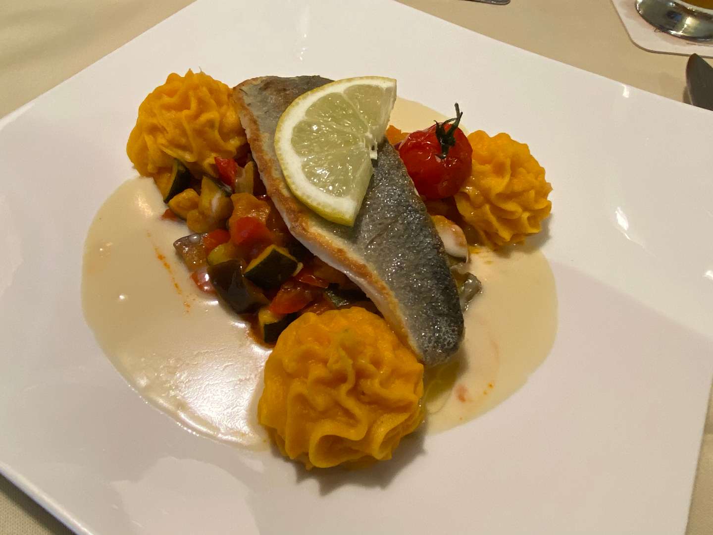 Wolfsbarsch auf Gemüse und Karottenkartoffelpüree
