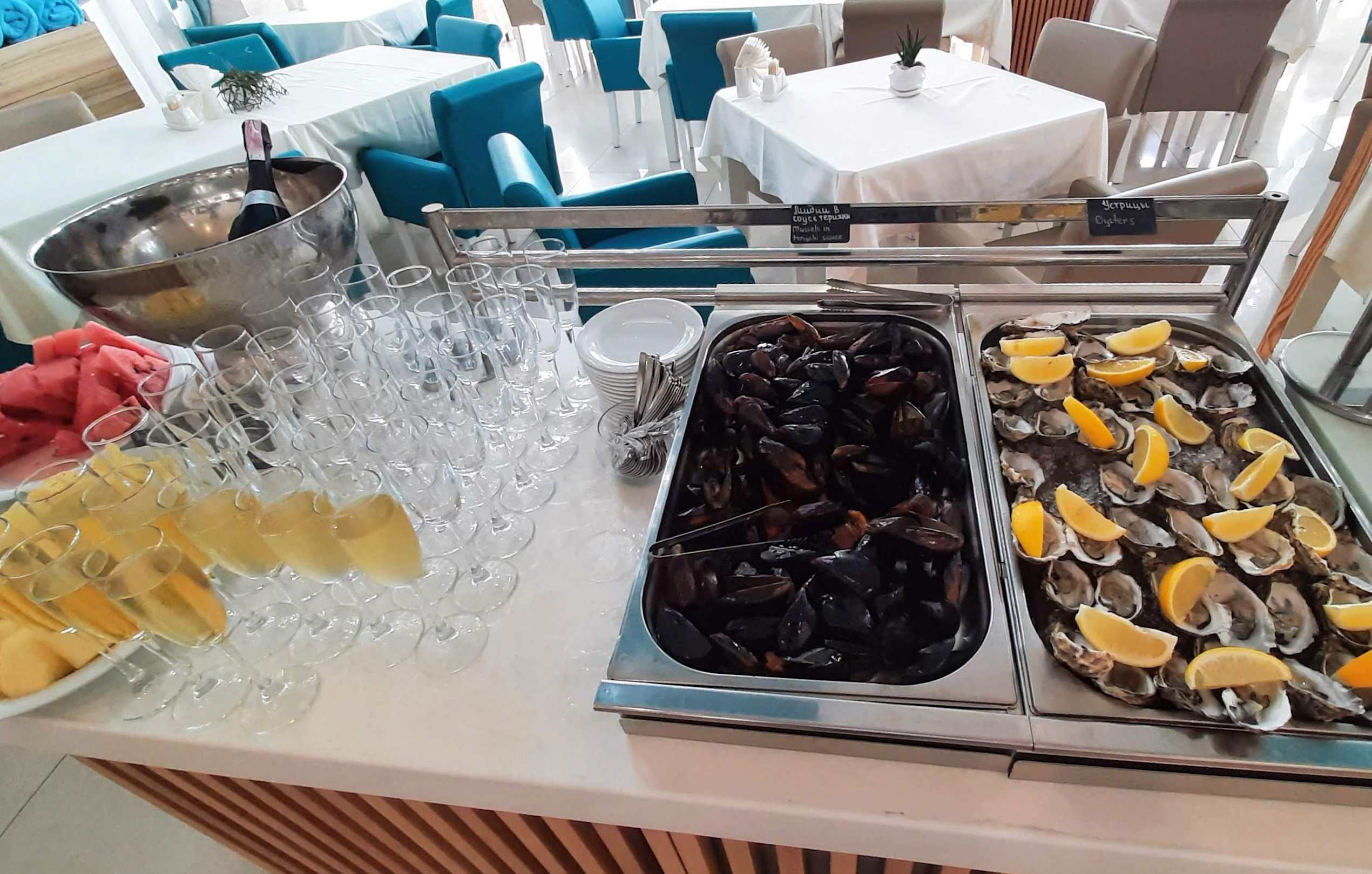 Frühstücksbuffet im Hotel. Mit Austern und Champagner. Soviel man wollte...