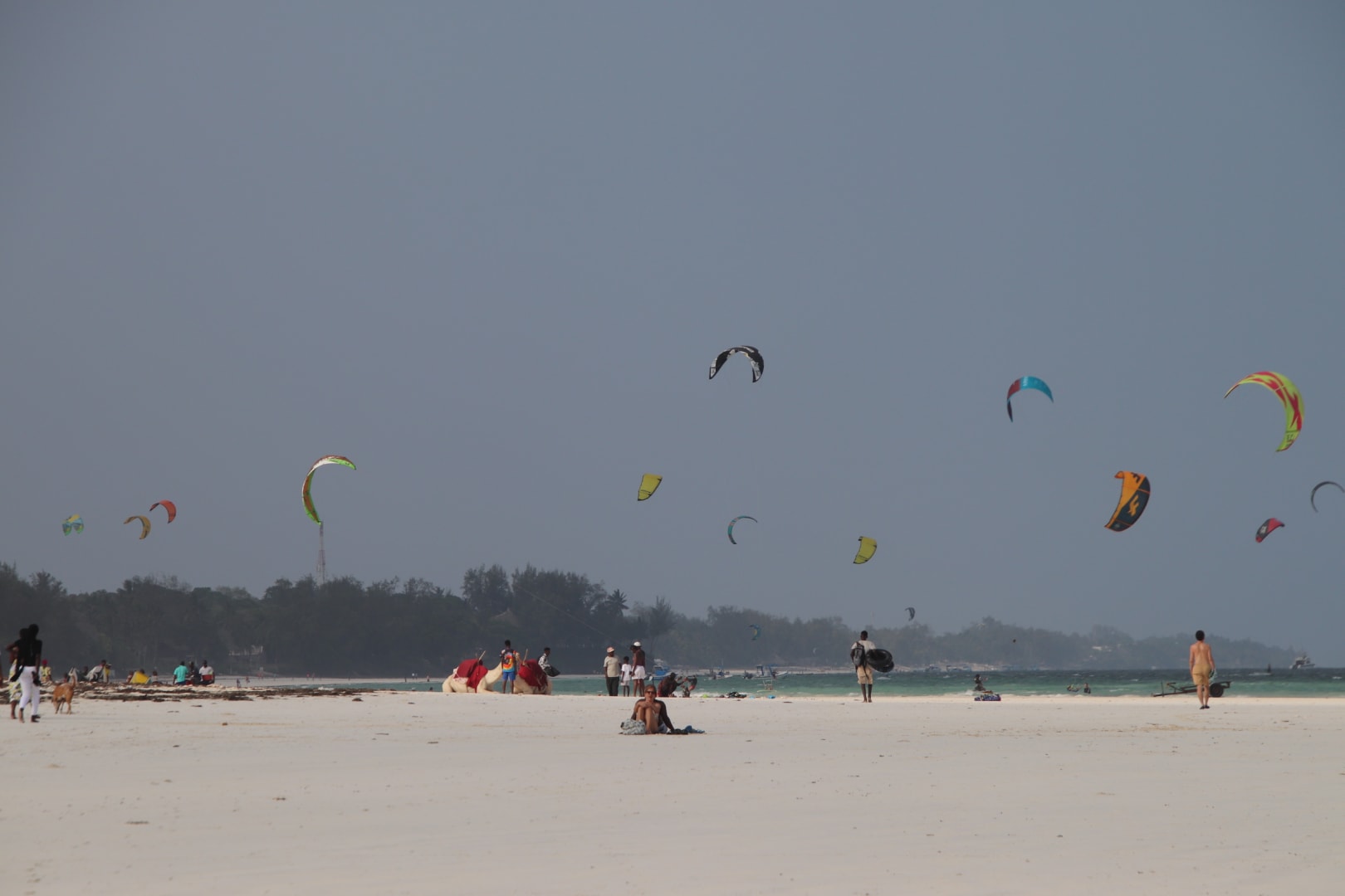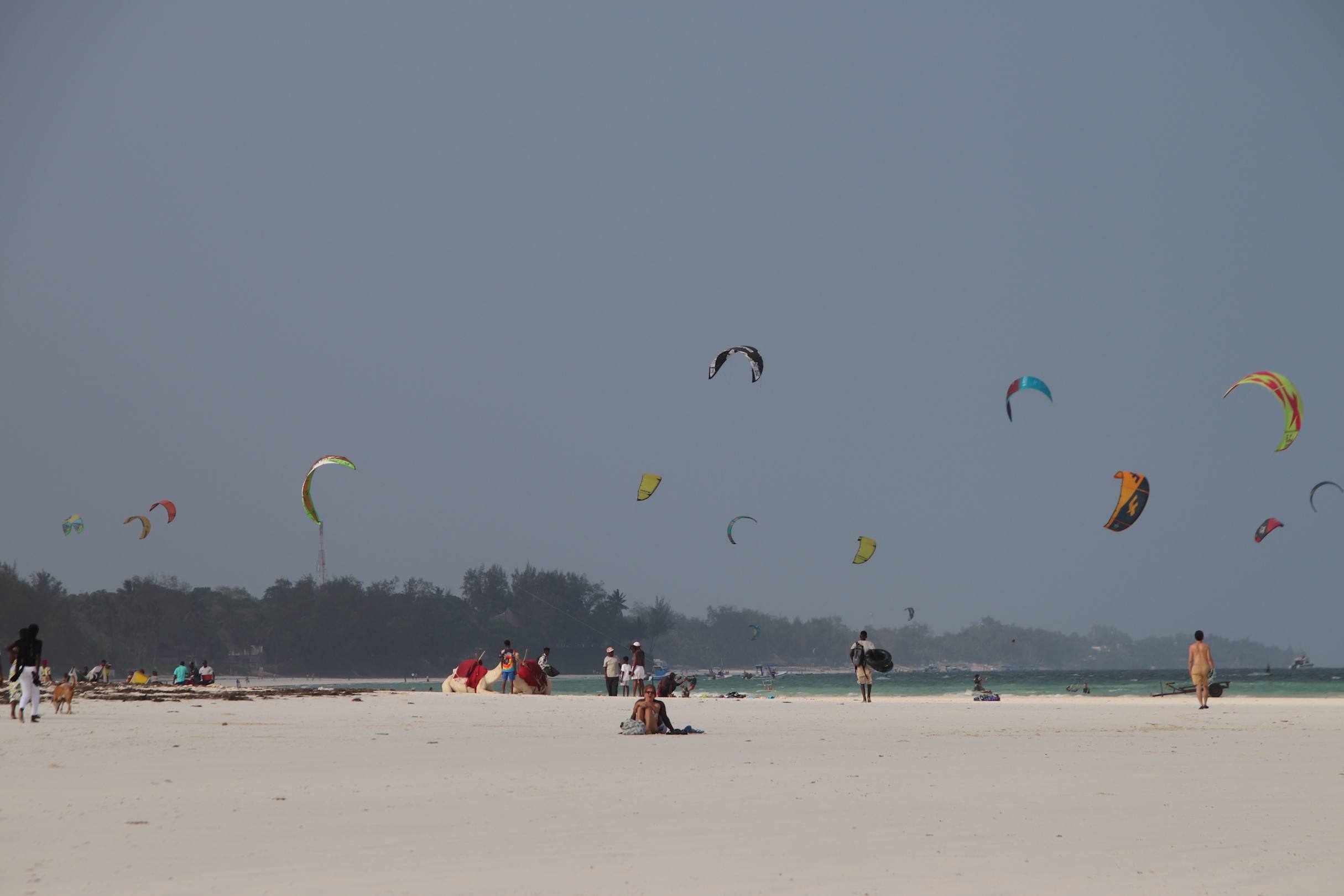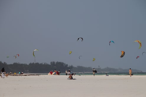 Buntes Treiben am Strand und Kyter im Hintergrund