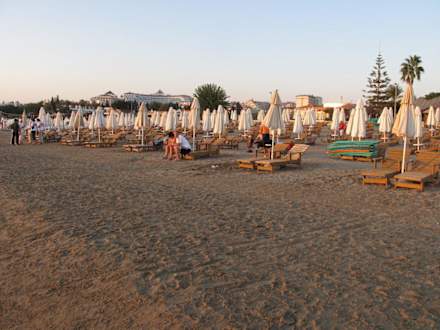 Der blitzsaubere Strand mit ungewöhnlich viel Platz zwischen den Liegen. Pro Sonnenschirm sind 2 Liegen zugeordnet. Die Auflagen für die Holzliegen bringt Hassan, der Strandboy, unaufgefordert