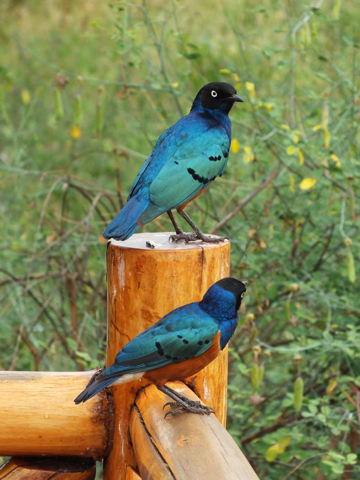 Bunte Vögel im Ngutuni Park auf der Terrasse.Fressen das Futter aus der Hand