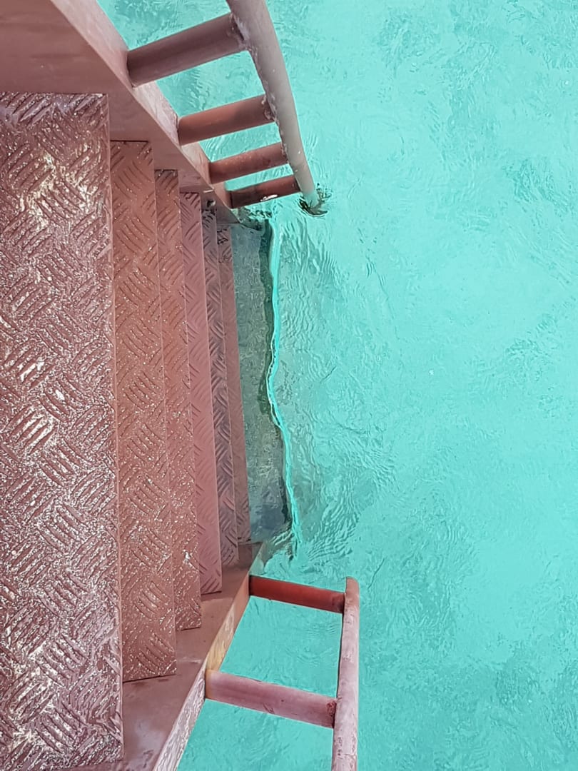 Treppe ins Meer, Stufen fehlen, Griff abgebrochen wackelig und scharfkanntig