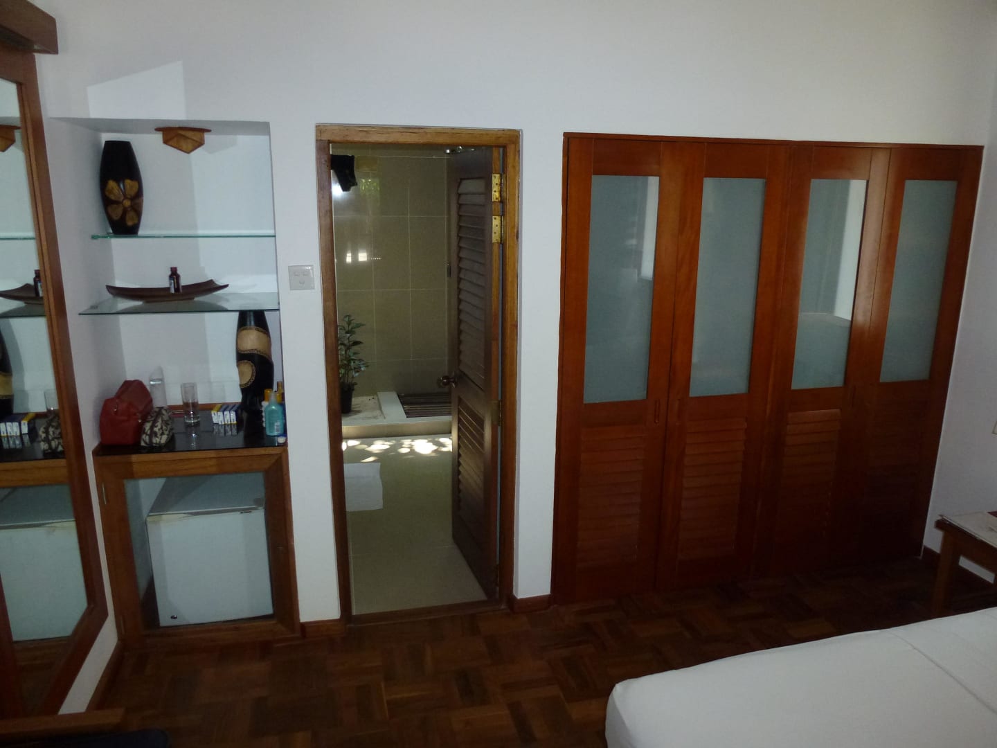 Minibar mit Ablage, Tür zum Bad und Kleiderschrank