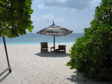 Blick vom Bungalow zum Strand aus unsere Liegen NH Collection Maldives Reethi Resort