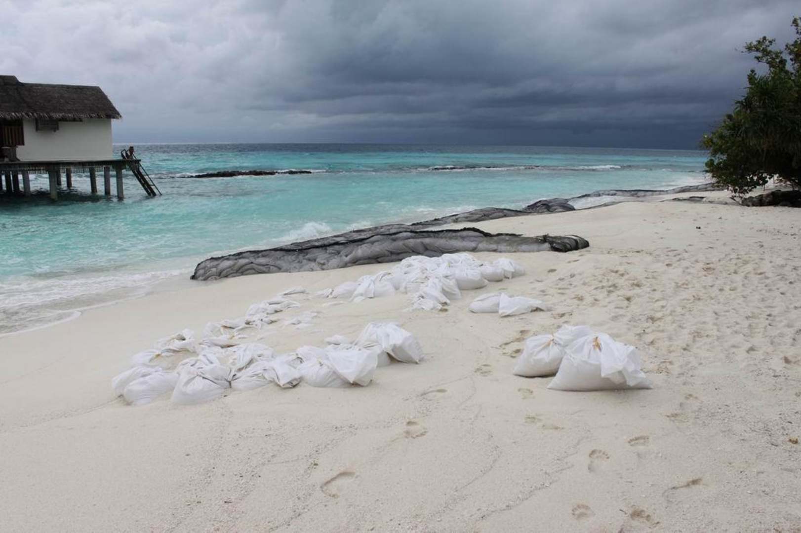 Hier sieht man den Ausblick von den Liegen bei den Wasserbungis. Sandsäcke und Sandsackbarrieren in Hülle und Fülle.