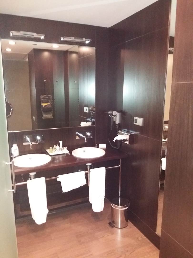 ZimmerDas Badezimmer. Links davon befindet sich die durch eine Glasscheibe getrennte Dusche/Badewanne/Toilette