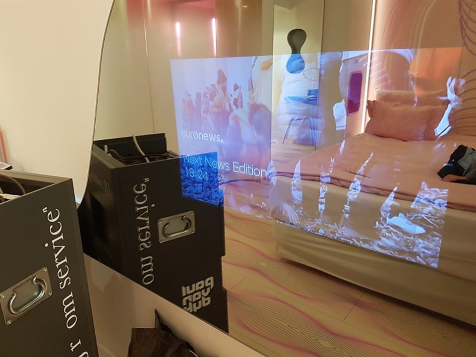 Der Fernseher ist in einem Spiegel eingelassen.