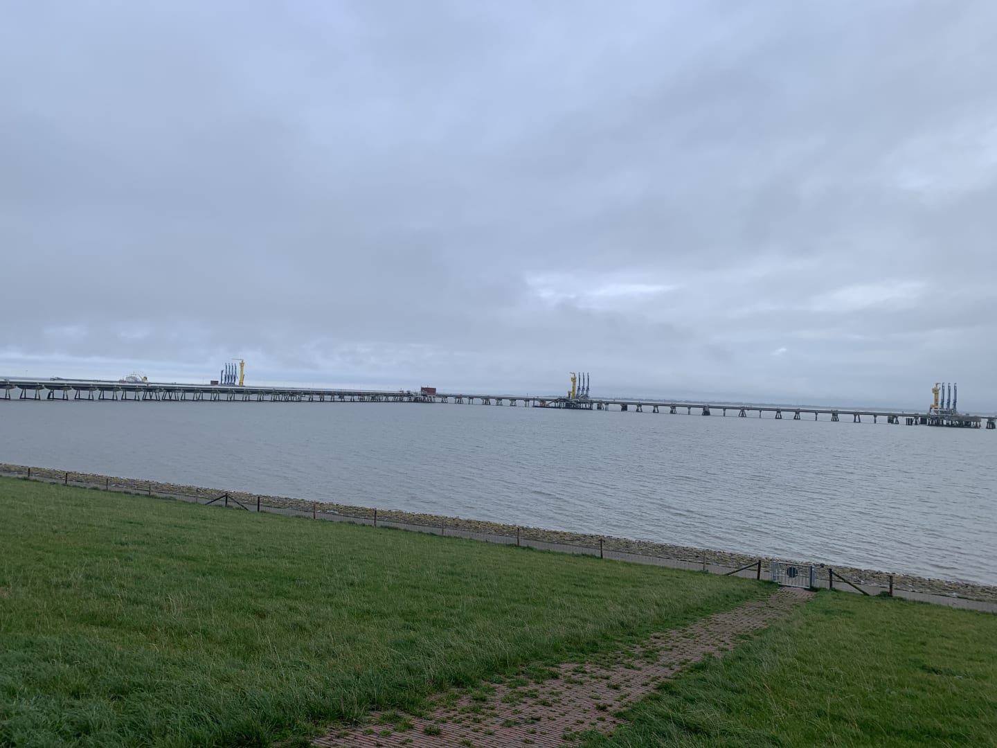 Blick vom Deich auf den Wanderweg und den Ölhafen direkt beim Hotel.