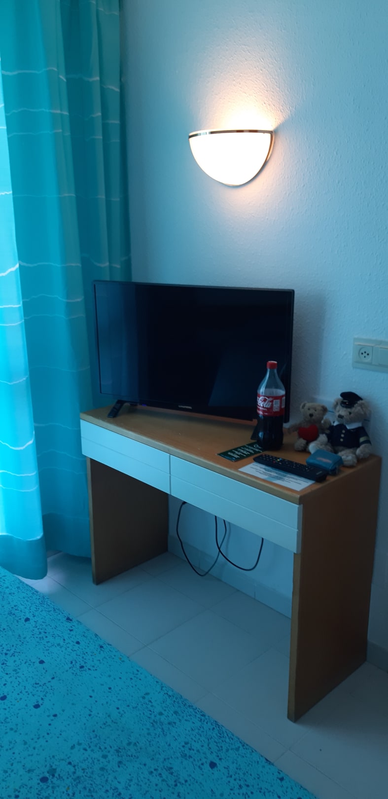 ZimmerDie Farbe der Überdecke und Vorhänge war sehr schön. Kleiner FlachbildTV
