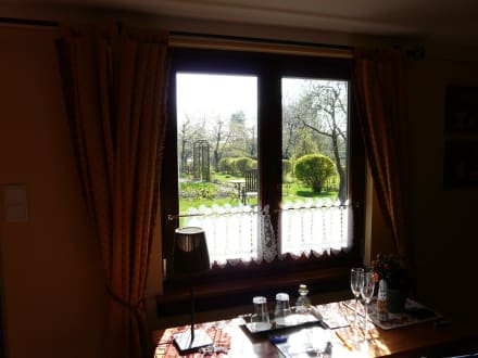 Der Blick morgens aus dem Zimmer in den Garten