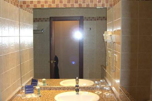 Waschbecken und Spiegel im BadHier gab es eine Duschhaube, einen Schuhpolierschwamm, einen Kamm sowie Duschgel, Shampoo und ein Stück Seife.