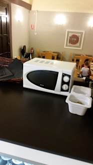 Mikrowelle zur Erwärmung der eigentlich warmen Speisen, welche immer lauwarm bis kalt waren