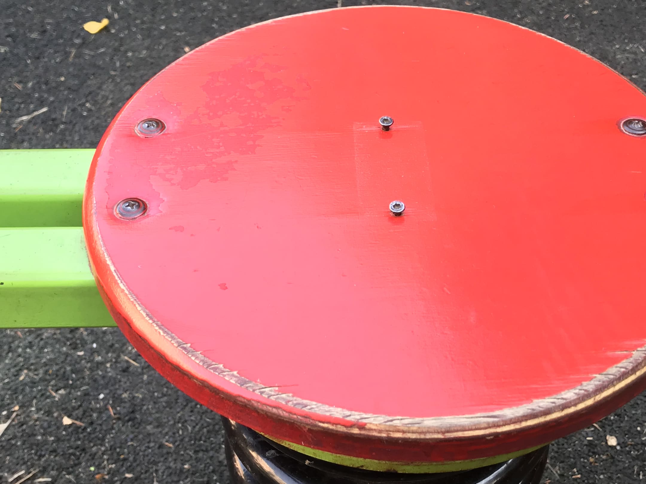 Schraubenköpfe gucken aus dem Holz an der Kinderwippe.