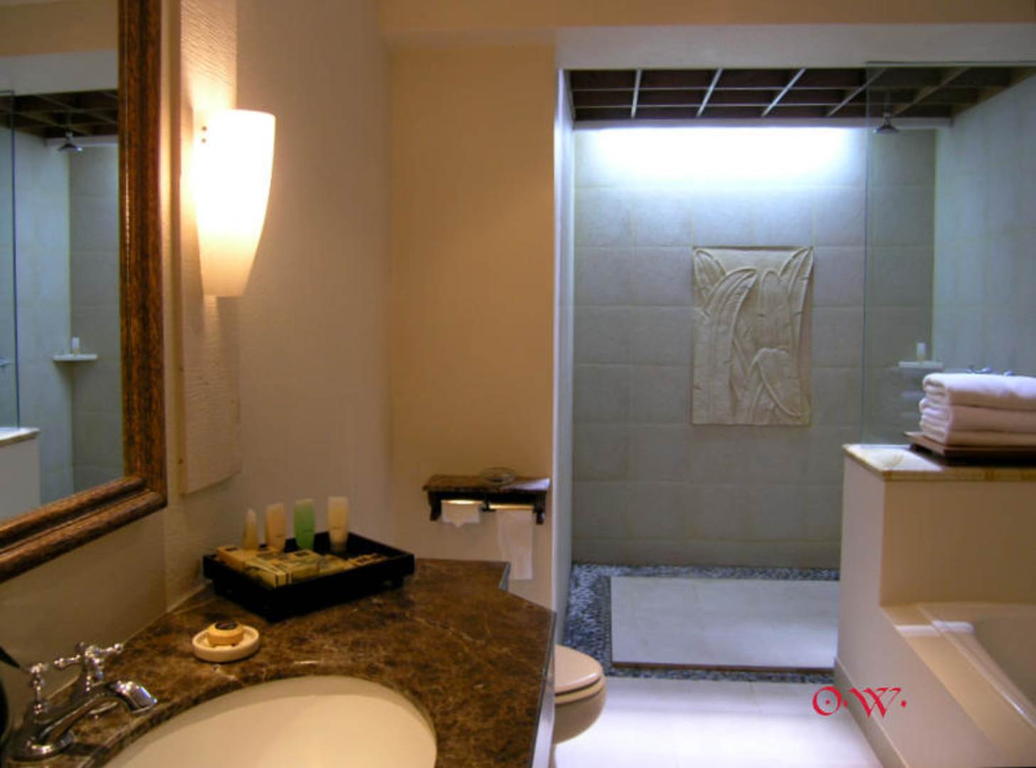 Das Bad hat im Duschbereich eine offene Decke und ist mit einem Relief versehen