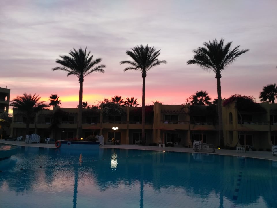 Sonnenuntergang bei wundervollen Farbenspiel mit Blick vom Pool auf Wohneinheiten,