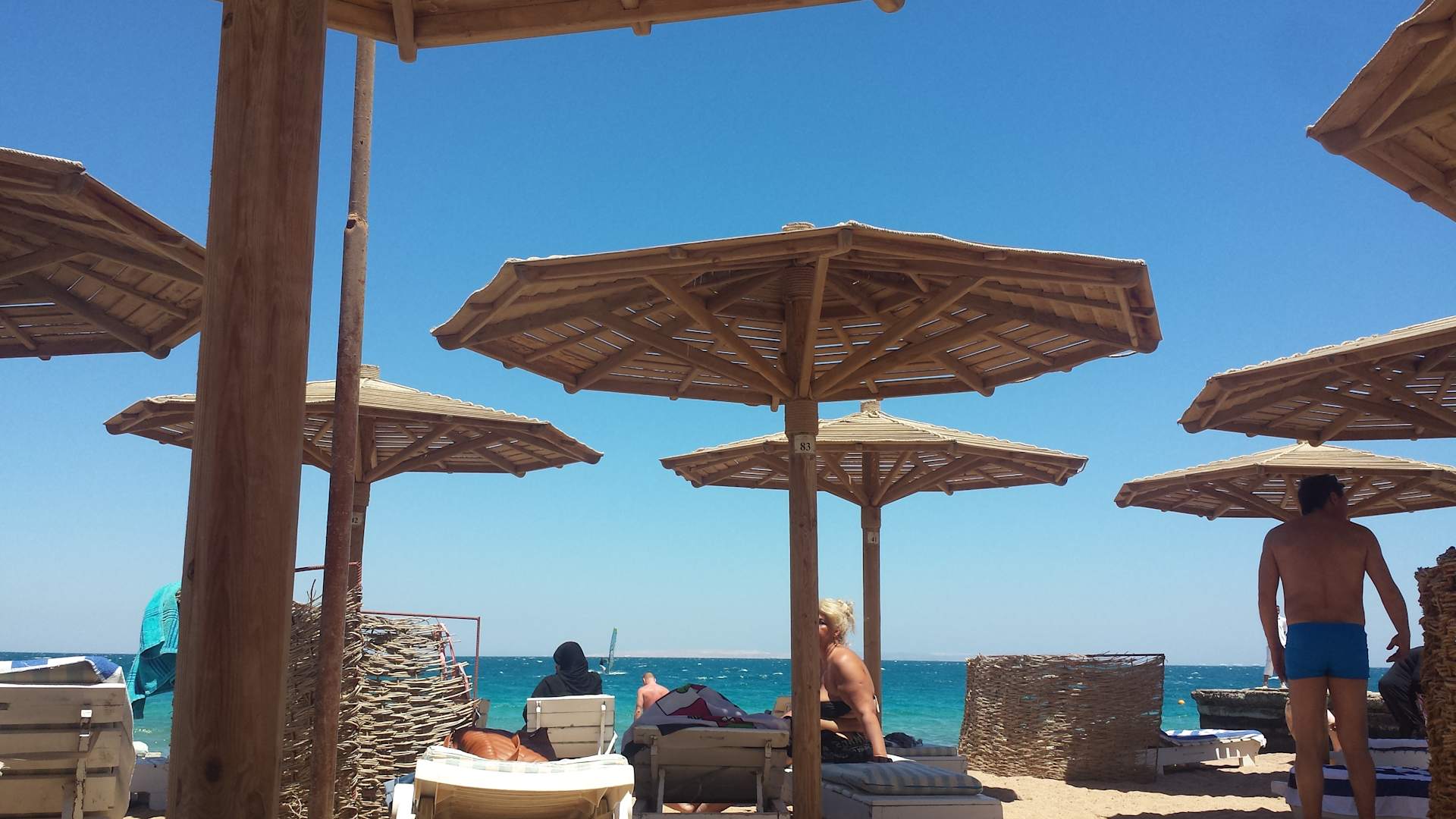 StrandUrlaubsfeeling am sauberen Strand mit Liegen, Matten, Schirmen und Windschutz. Das Wasser ist ein Traum - besonders klar und paradiesisch türkis.