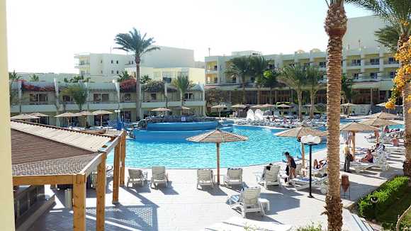 Blick vom Zimmer auf die Poolanlage