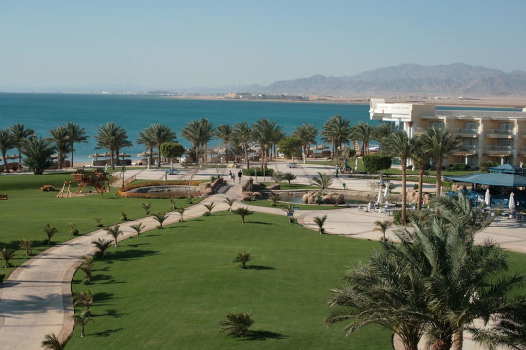 Gartenanlage mit anschließendem Badestrand. Safaga im Hintergrund.