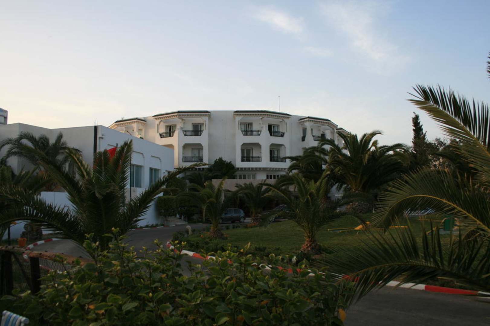 Blick vom Spielplatz auf den Hoteleingang