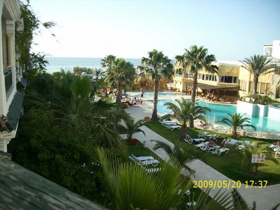 Blick auf die Poolanlage und das Meer