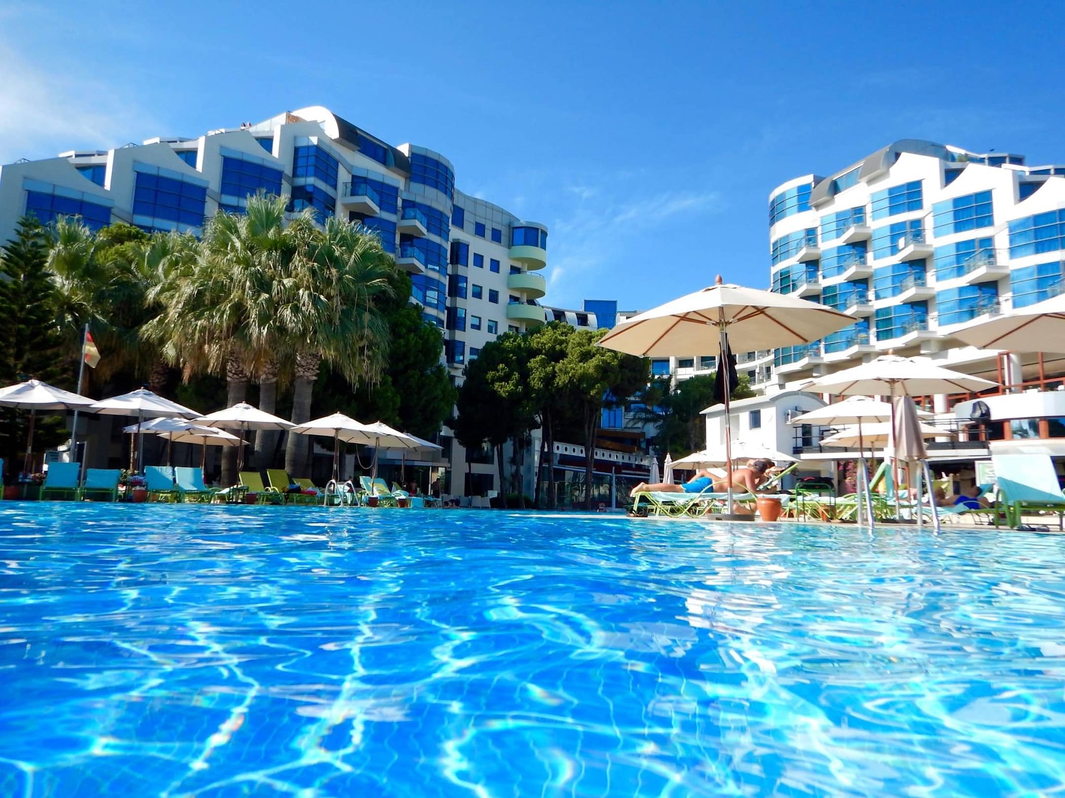 Blick vom Pool zum Hauptgebäude