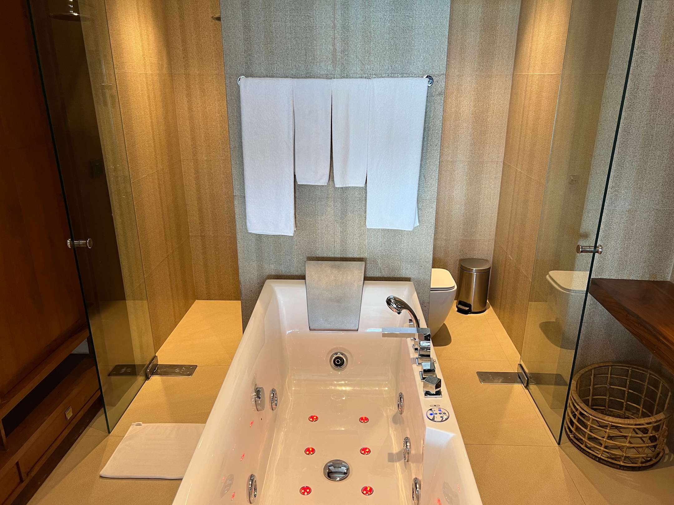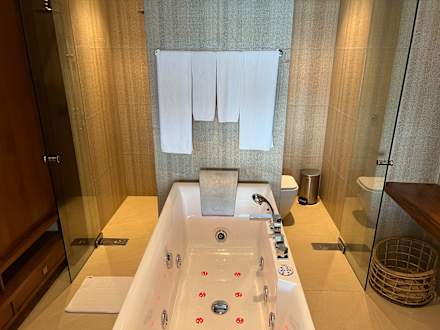 ZimmerWhirlpoolbadewanne im Bad, links Dusche, rechts Toilette