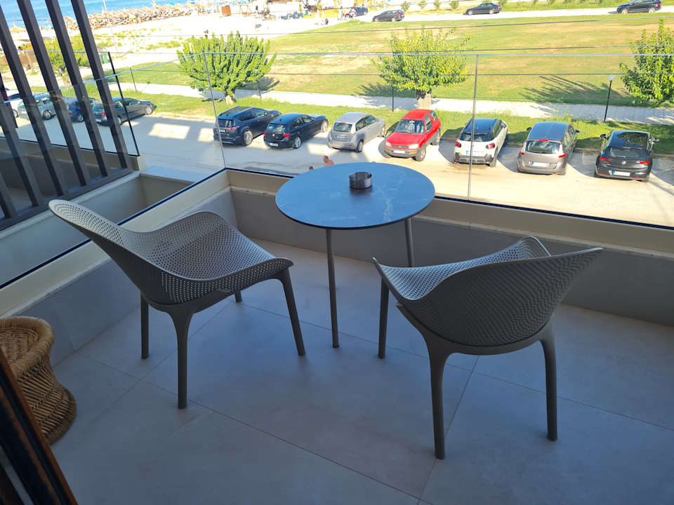 Balkon mit gemütlicher Sitzgruppe und Wäscheständer
