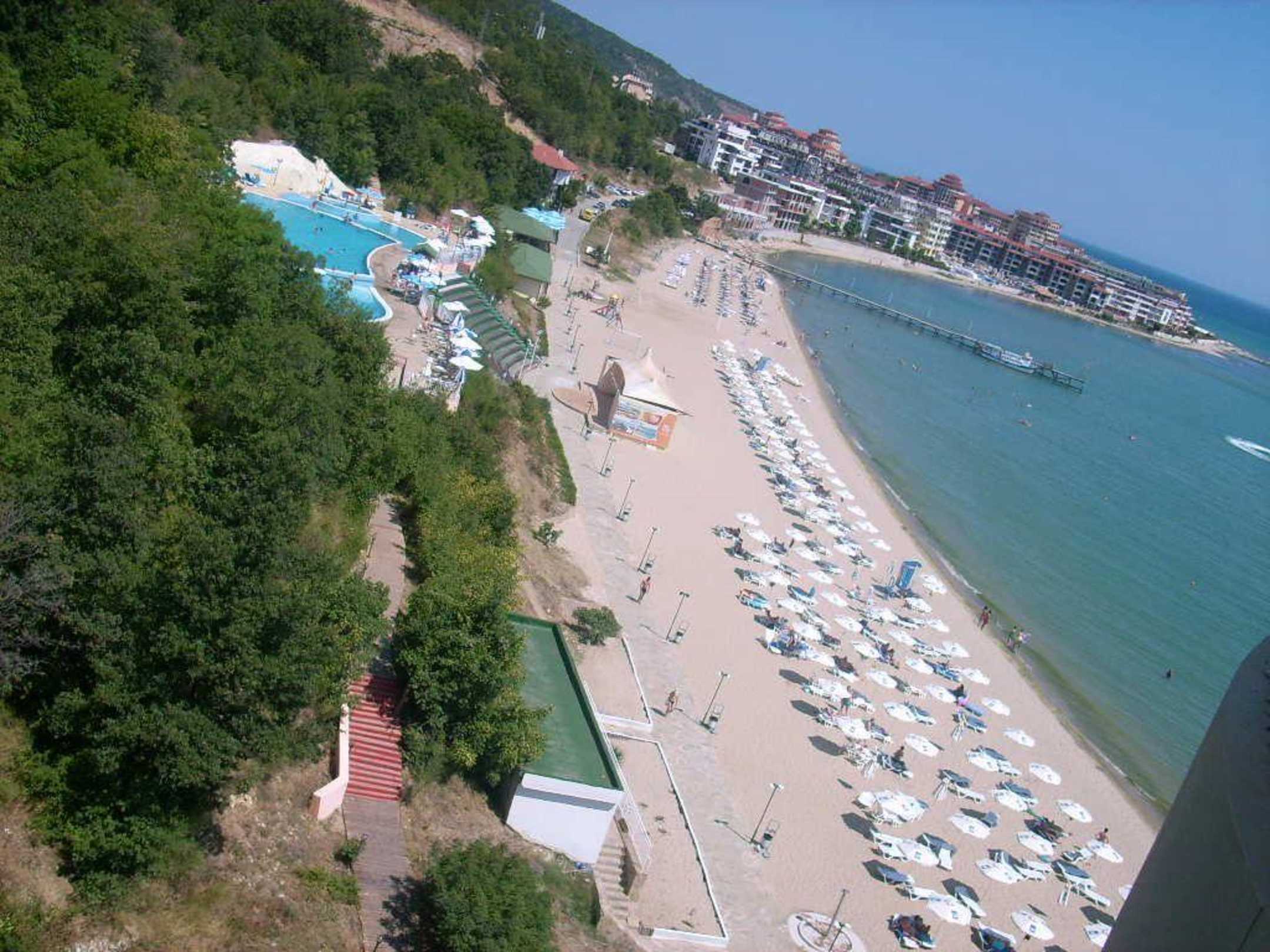 Man sieht einmal den großen Pool links, wo sich Liegen sowie eine Poolbar befinden, sowie den eigenen Strand wo ebenfalls ausreichend Liegen vorhanden waren.