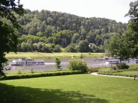 Blick vom Zimmer des Parkhotels in Bad Schandau auf die Elbe und den hauseigenen Park