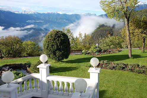 Morgendlicher Blick ins Tal und auf die Dolomiten