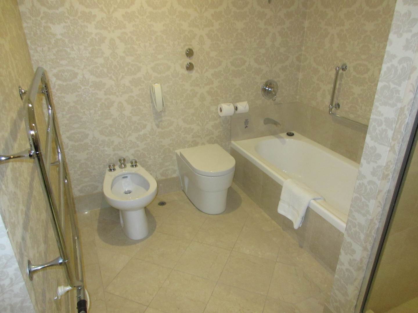Badezimmer mit Wanne, WC, Dusche, Bidet und Waschbecken.
