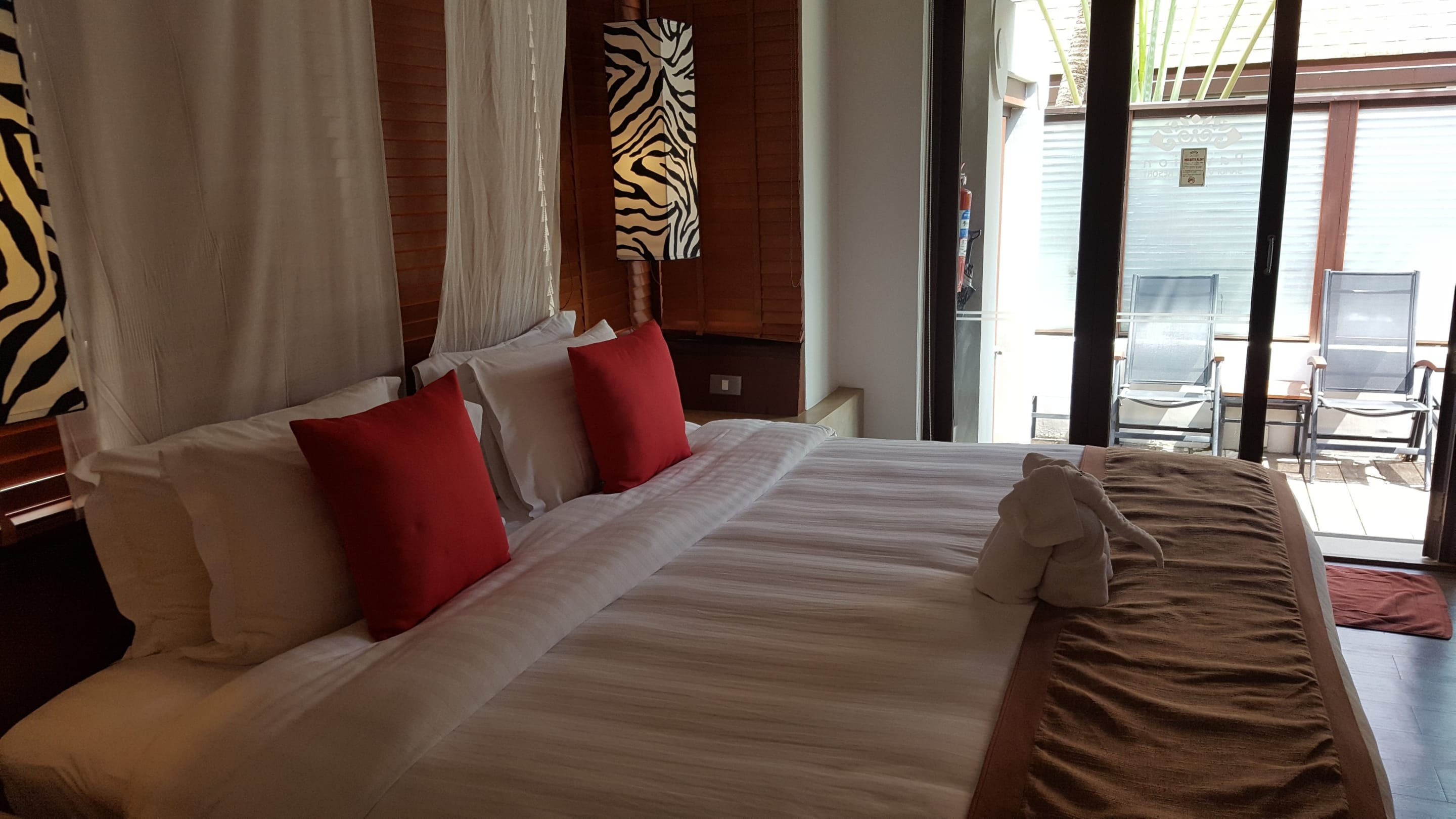 Blick vom Schlafzimmer nach draussen zum Vorplatz mit dem Pool der Hydropool-Villa
