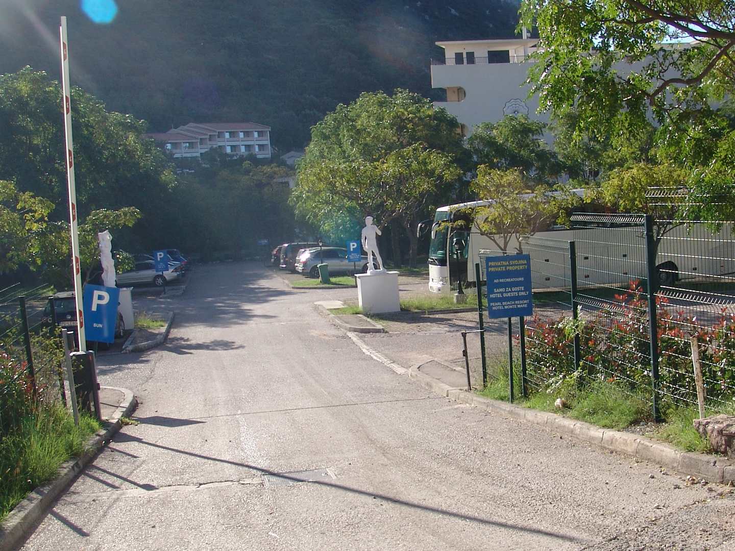 Schmale Einfahrt zum Hotelkomplex mit fast nicht erkennbarem Schild.