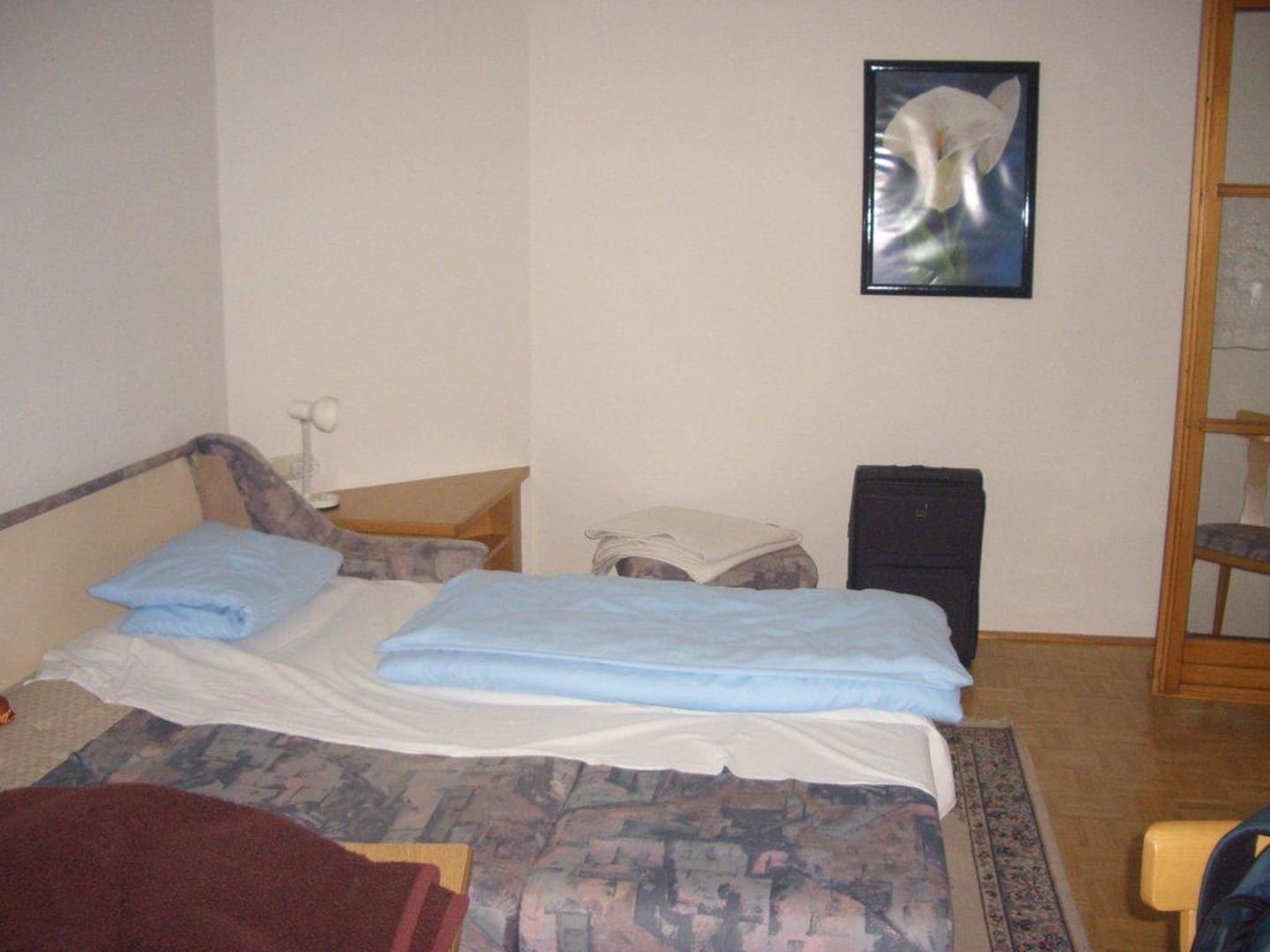 Im Wohn/Esszimmer, dass nach verschüttetem sauren Gurkenwasser und altem Rauch roch, steht das Schlafsofa direkt neben der Küchenzeile inkl. ziemlich altem Kühlschrank.