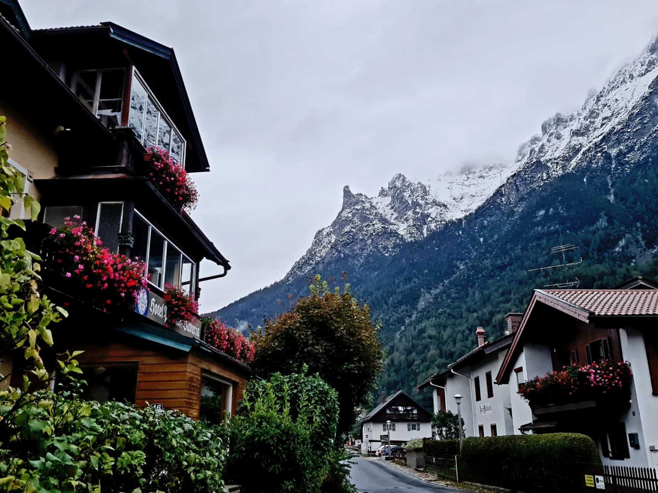 Außenansicht auf die Pension.Zimmer mit Wintergarten und Blick auf den Karwendel