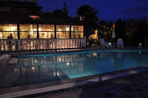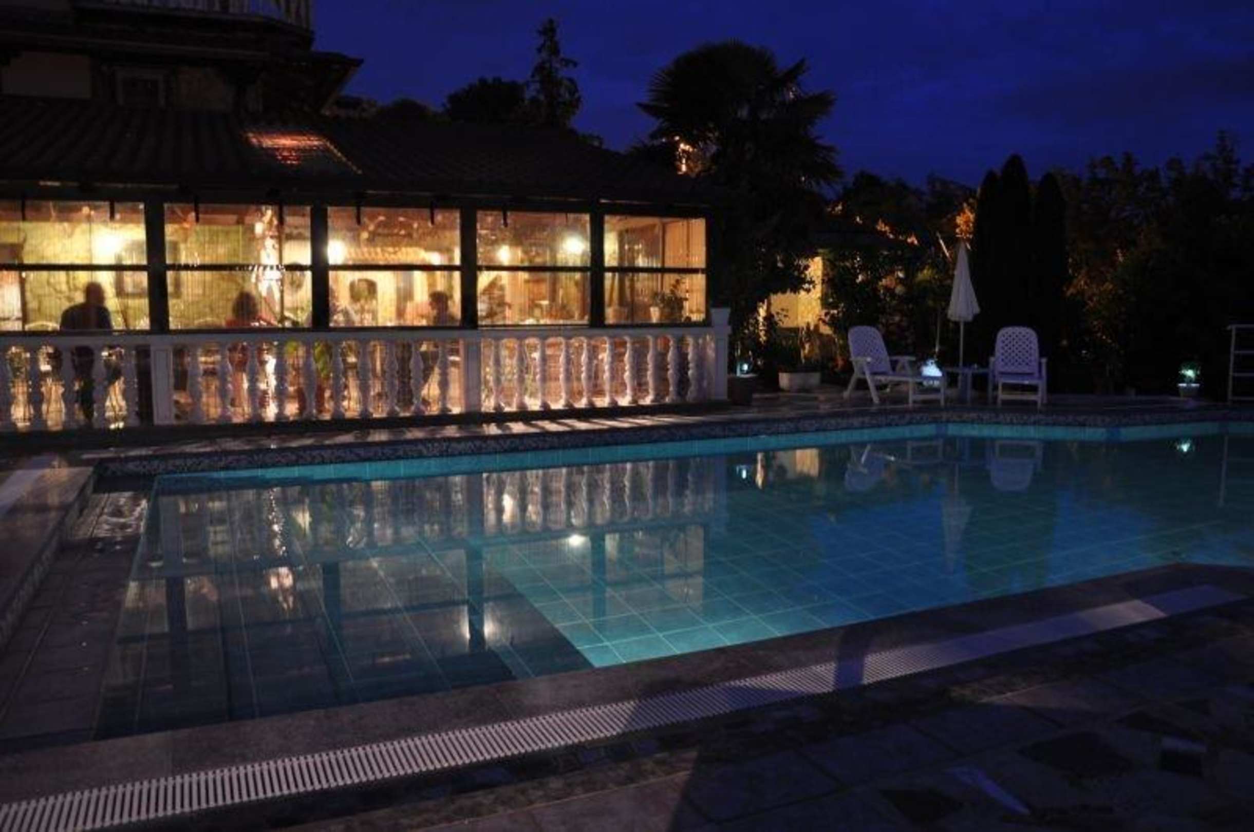 Abendstimmung am Pool mit Blick auf Terrasse