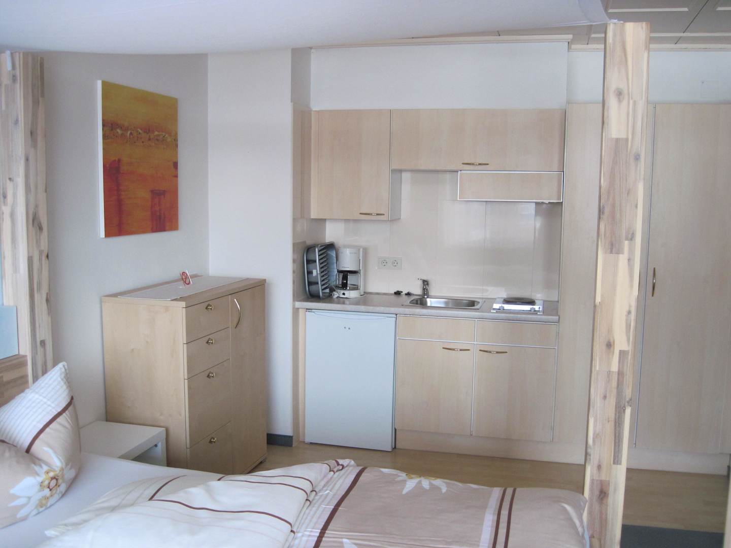 Die Küchenzeile. Kaffeemaschine, 2-Plattenherd, Kühlschrank, Geschirr vorhanden