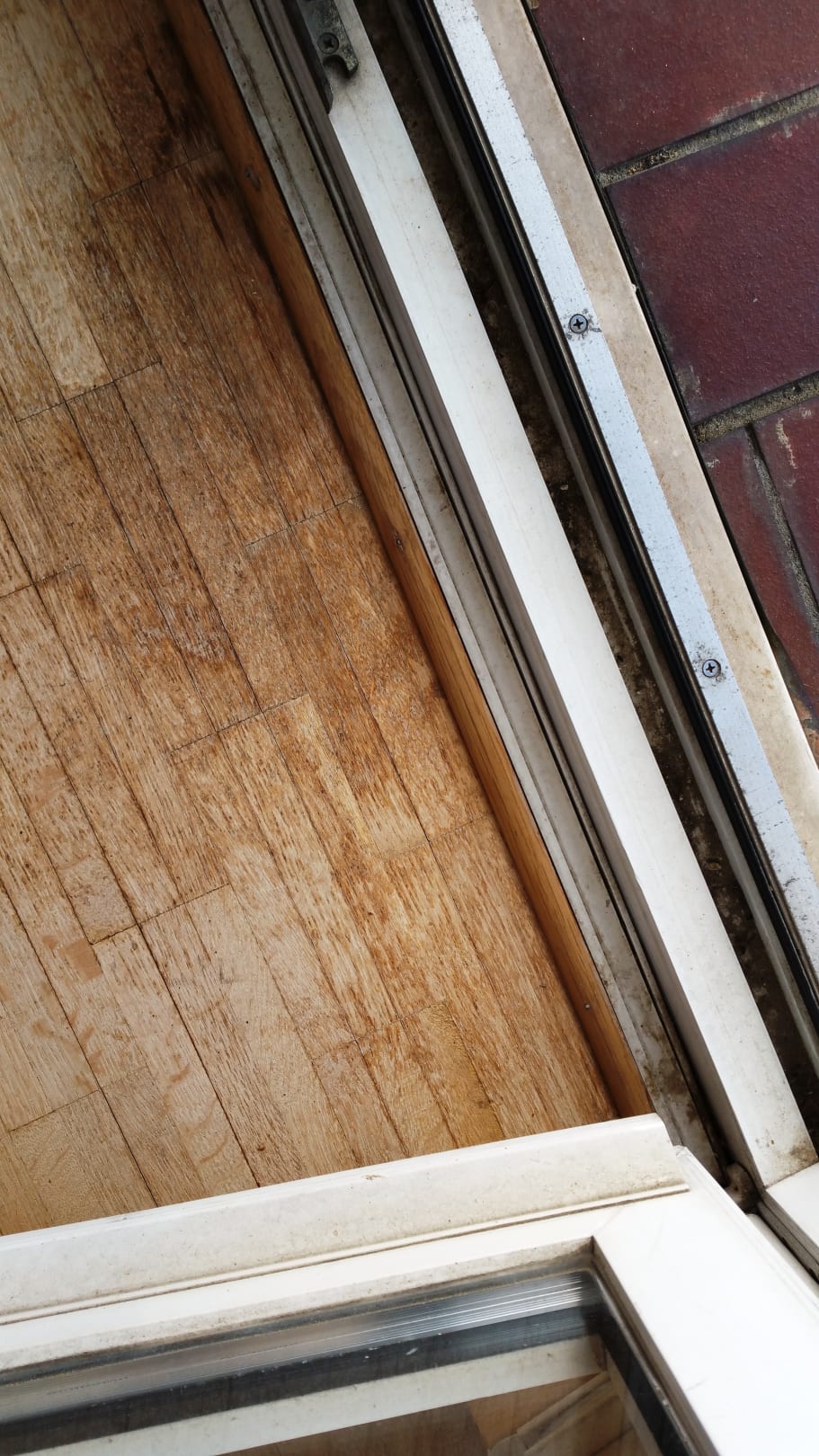 ungeptzte Fenster mit jeder Menge Schmutz in den Rillen