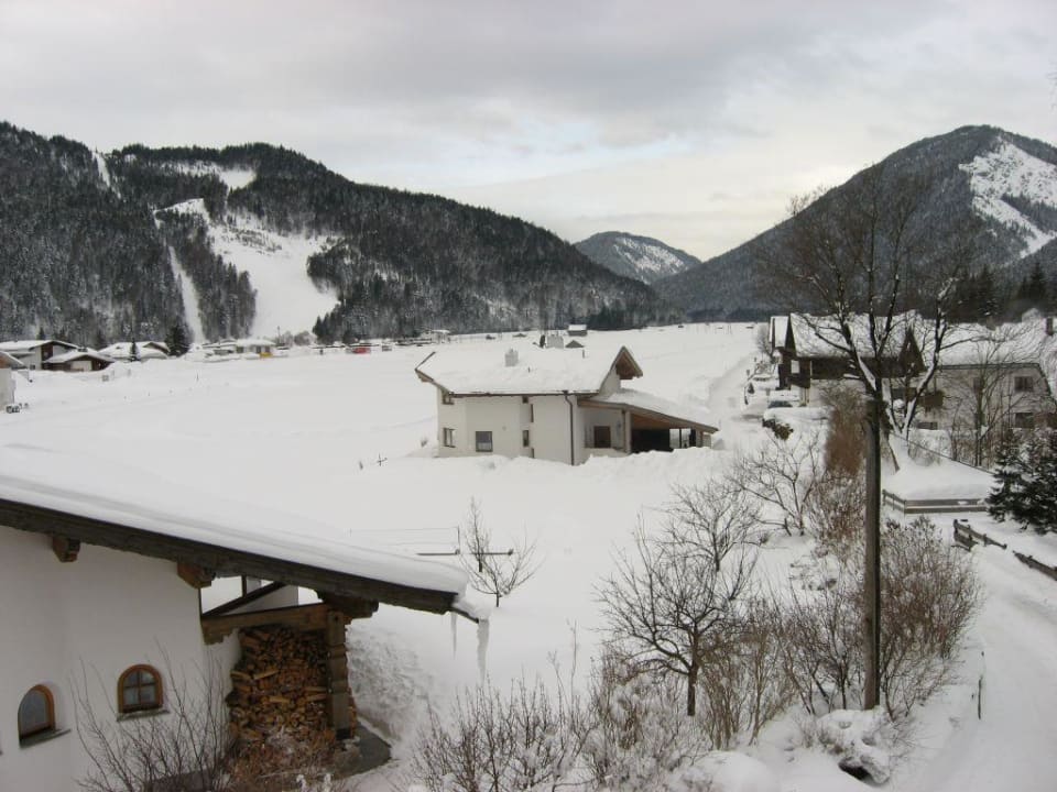 Blick vom Balkon auf die Loipe und Bergwelt