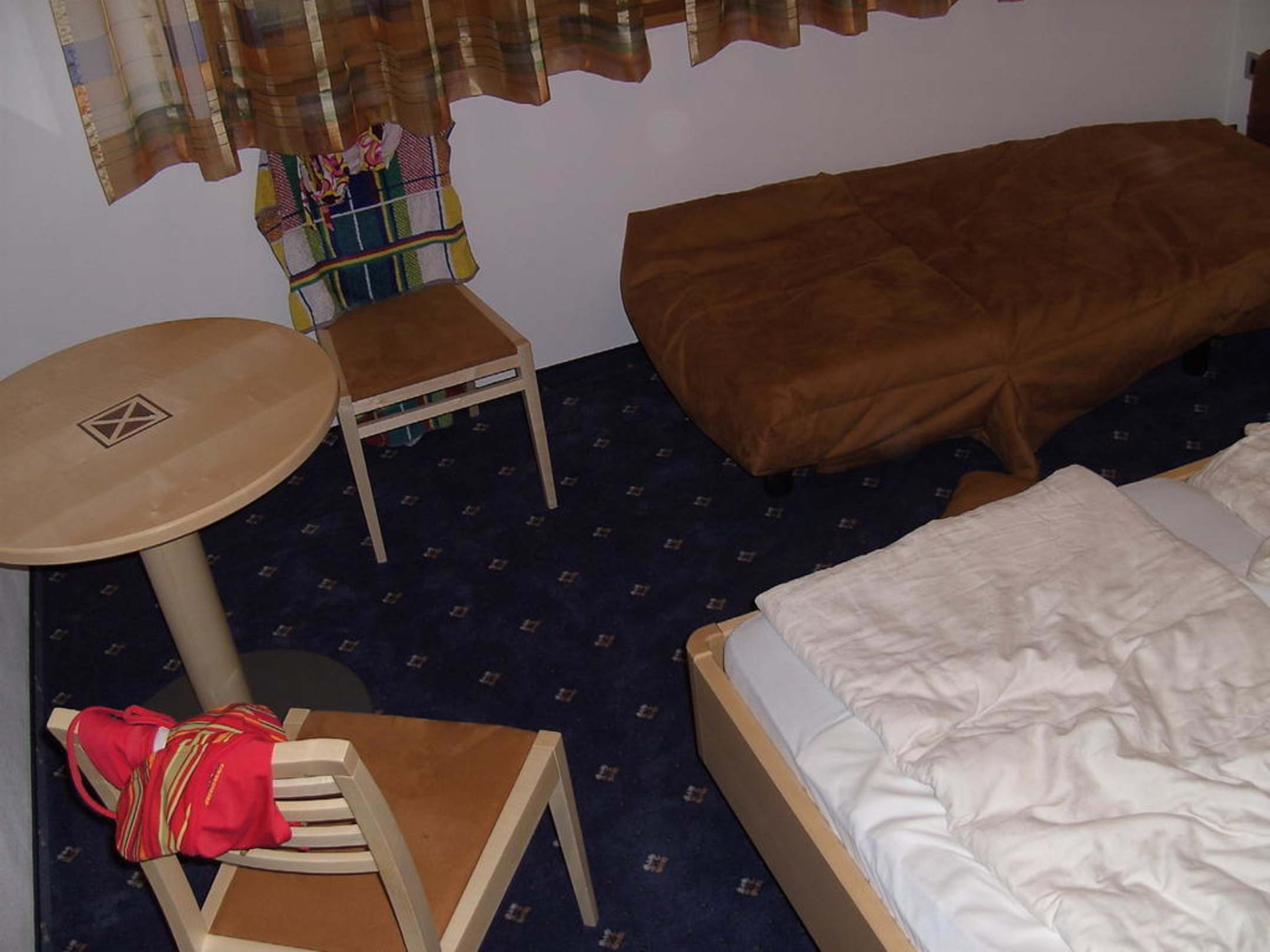 Das Schlafzimmer mit einem Tisch, 2 Stühlen, einem Extrabett und einem Doppelbett.