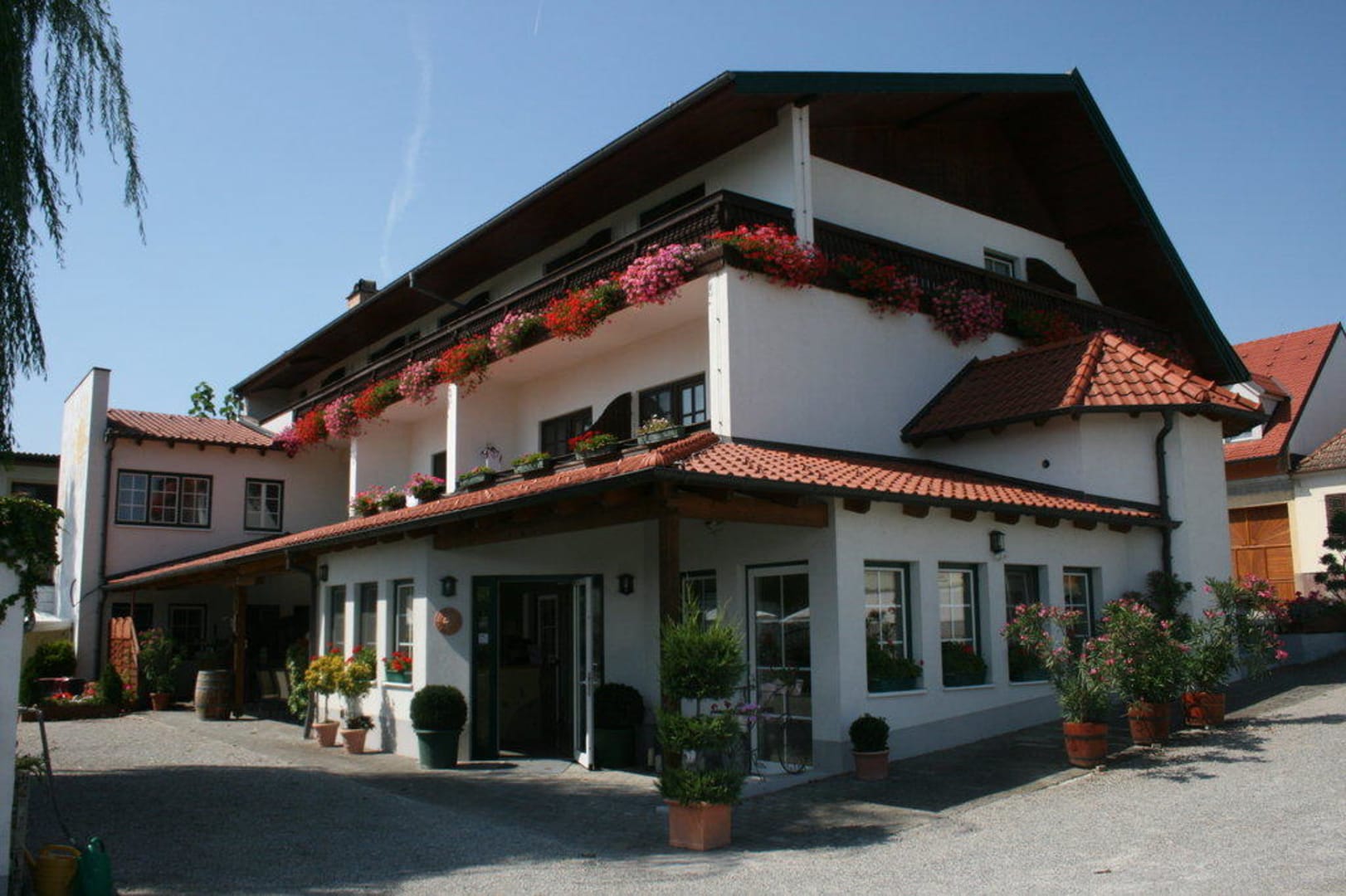 Eine sehenswerte Fassademan sieht hier den Eingang zur Rezeption und zu den Zimmern, sowie die Balkonzimmer im ersten und zweiten Obergeschoss.