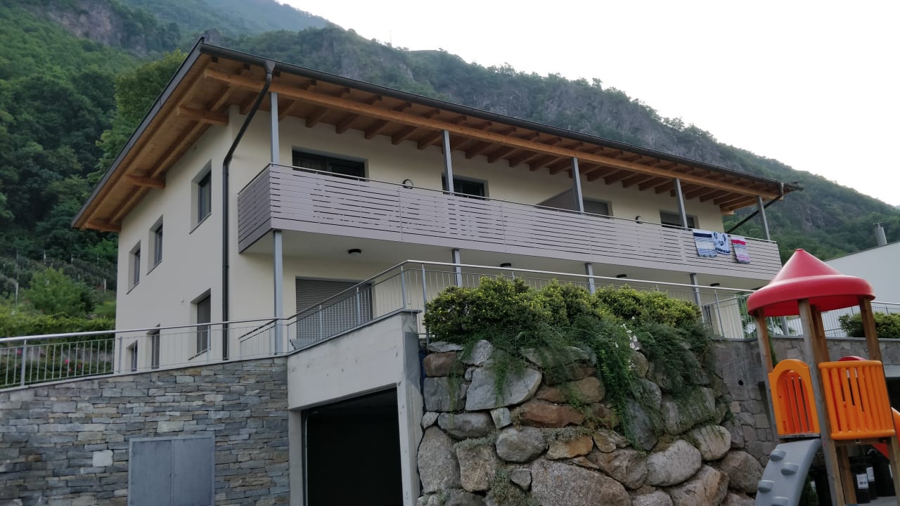 Blick auf die Ferienwohnungen und den Eingang der Tiefgarage
