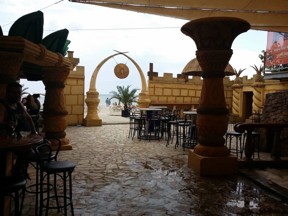 Blick zum Wasser aus dem Strandclub Luxor mit Riesenbar und Rutsche, am Tag für die kleinen und nach 24 Uhr für die großen Kinder, diese endet an der Tanzfläche. Der Riesenspaß ist nach Mitternacht auch zu hören.