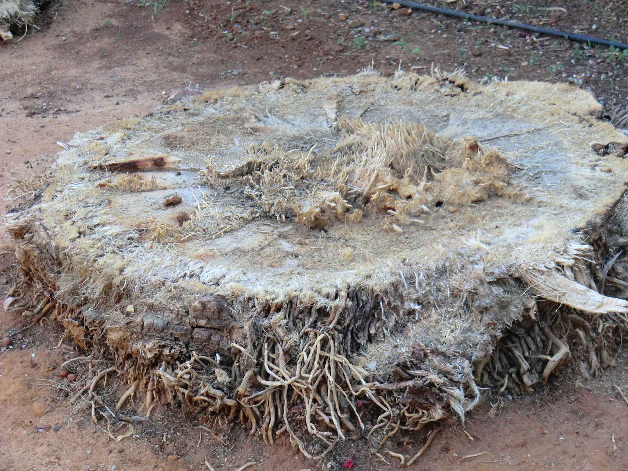 Eine von etlichen Palmen,die in der Gartenanlage vom "Palmrüssler"befallen waren.Man sieht noch die Frasskanäle des Käfers........