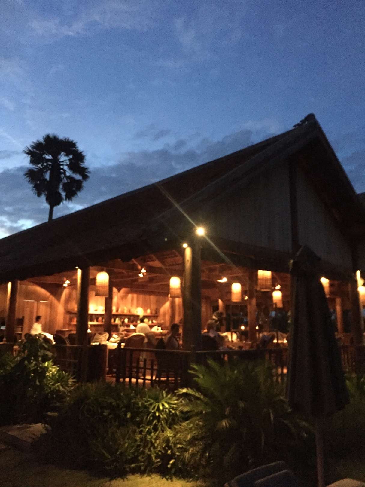 Eines der beiden Restaurants am Abend mit Blick auf die Poolanlage.