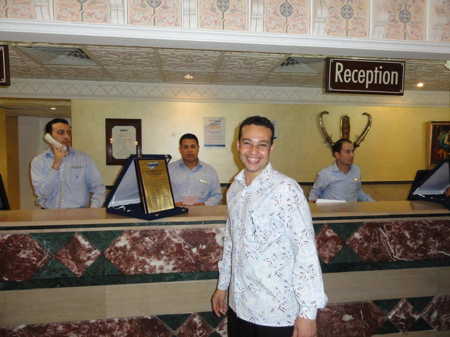 Personal der Rezeption und davor der Bar Manager