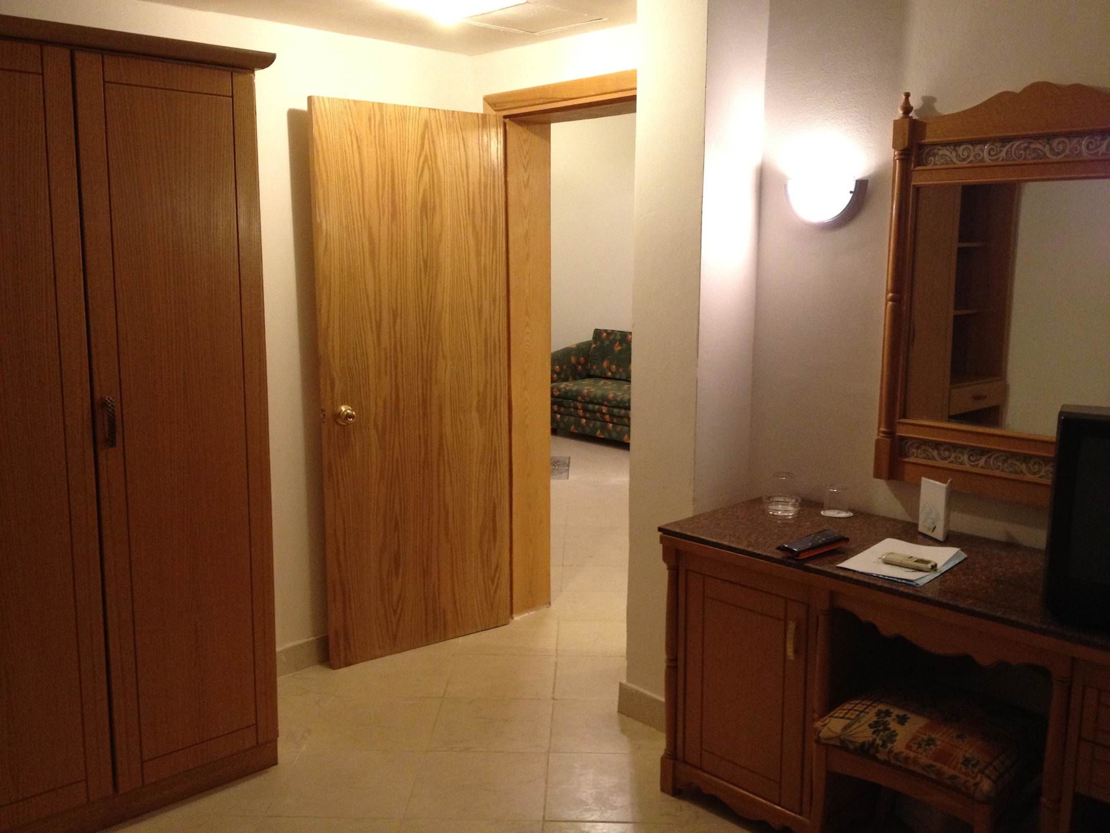 Suite: SchlafzimmerBlick in Richtung Eingangsbereich/Wohnzimmer mit Fernsehen und Couch